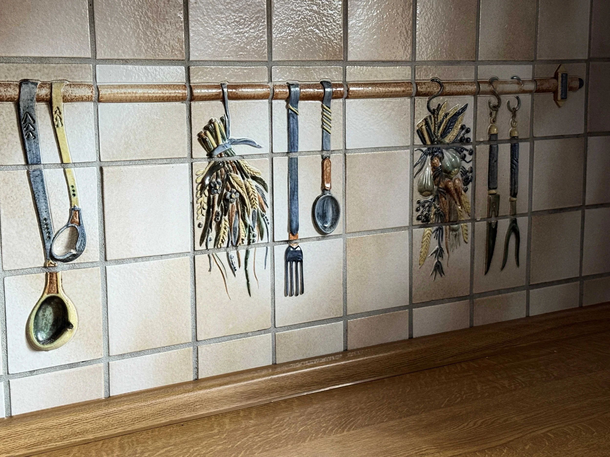Ebenso haben wir die in die Fliesen eingelassenen Küchenschränke saniert und konnten so die wunderschönen Fliesen mit den unterschiedlichsten Ornamenten auf den Wänden erhalten.