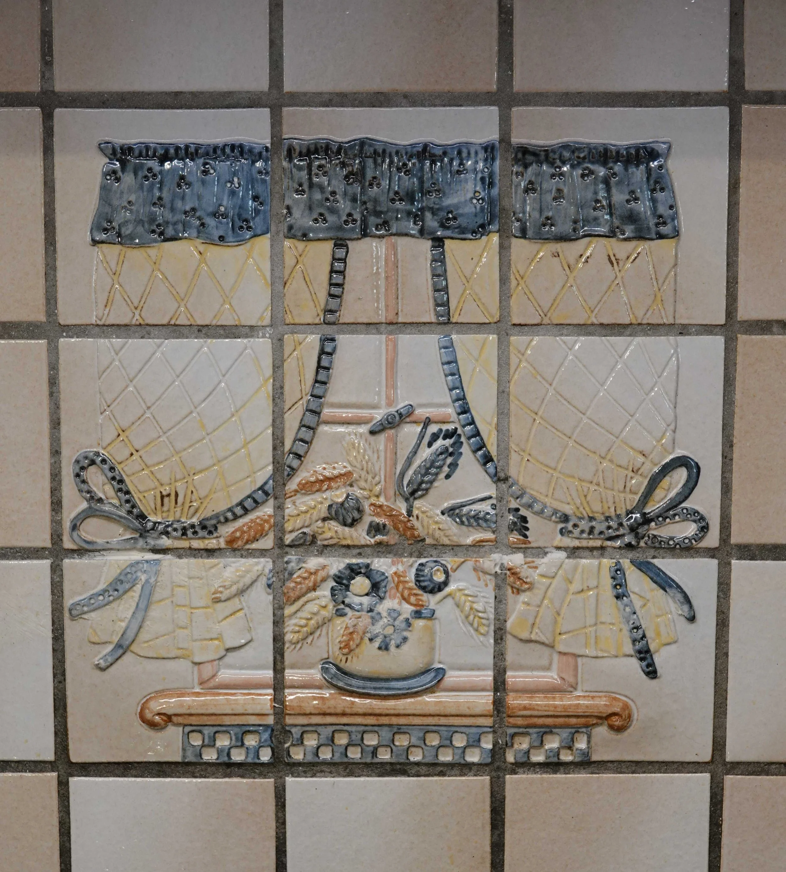 Ebenso haben wir die in die Fliesen eingelassenen Küchenschränke saniert und konnten so die wunderschönen Fliesen mit den unterschiedlichsten Ornamenten auf den Wänden erhalten.